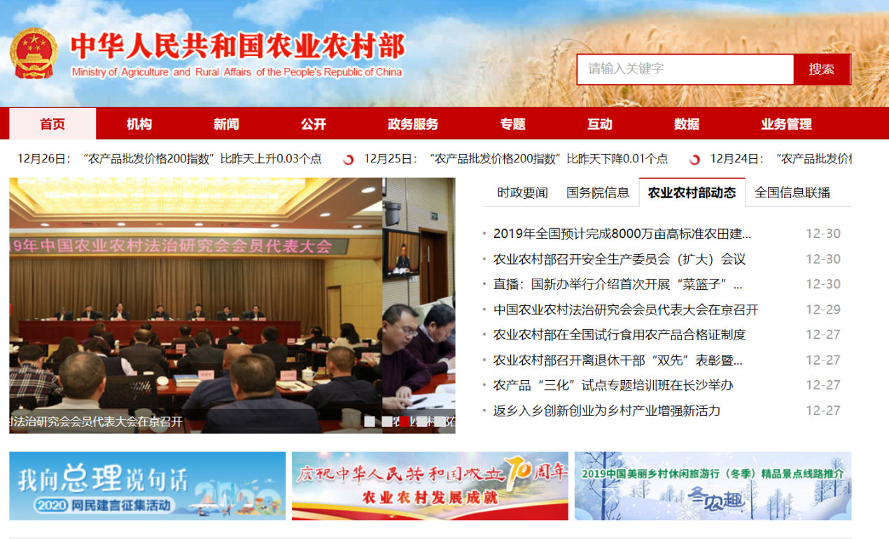 2019年,農業農村部網站信息公開專欄共主動公開信息1166條,政務網站共發布信息3.7萬條,網站總點擊量達到23.8億次,日均瀏覽量達370萬次,總瀏覽量達13億次,總訪問者達6489.4萬個。