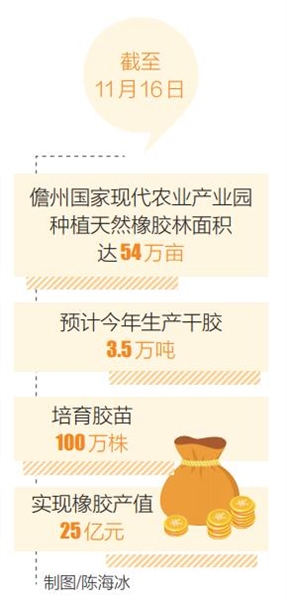 儋州市加快國家現代農業產業園建設,大力發展天然橡膠主導產業。截至11月16日,儋州國家現代農業產業園種植天然橡膠林面積達54萬畝,預計今年生產干膠3.5萬噸,培育膠苗100萬株,實現橡膠產值25億元,帶動園區內農村居民人均可支配收入達1.77萬元。