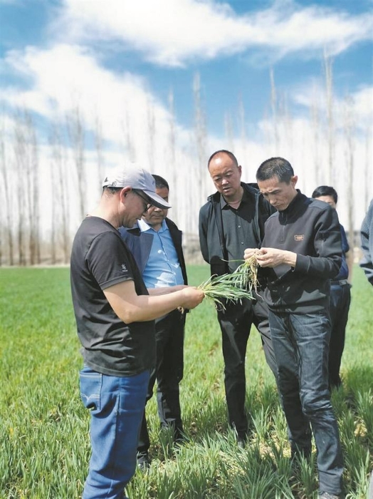 4月18日,兵團(tuán)農(nóng)業(yè)技術(shù)推廣總站與新疆農(nóng)墾科學(xué)院、石河子農(nóng)科院的專家組成小麥專家技術(shù)服務(wù)團(tuán),在八師一四四團(tuán)田間地頭,現(xiàn)場(chǎng)開(kāi)展技術(shù)指導(dǎo)。今年,兵團(tuán)采用新技術(shù)新模式助力春耕春播量質(zhì)齊升。王海標(biāo) 攝