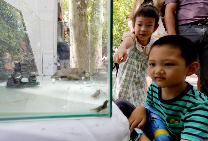 9月22日,豐收節(jié)農(nóng)產(chǎn)品市集上的崇明區(qū)橫沙島野生甲魚吸引小朋友的目光。