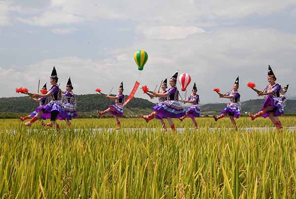 9月15日,人們在田野里表演舞蹈《吹響蘆笙慶豐收》。