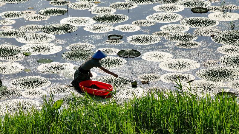 7月22日,農民在江蘇省昆山市巴城鎮正儀青澄芡實基地追施有機肥(無人機照片)。