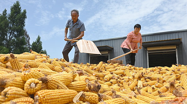 8月11日,四川省內(nèi)江市東興區(qū)楊家鎮(zhèn)觀音井村,糧農(nóng)在曬場(chǎng)堆放玉米。