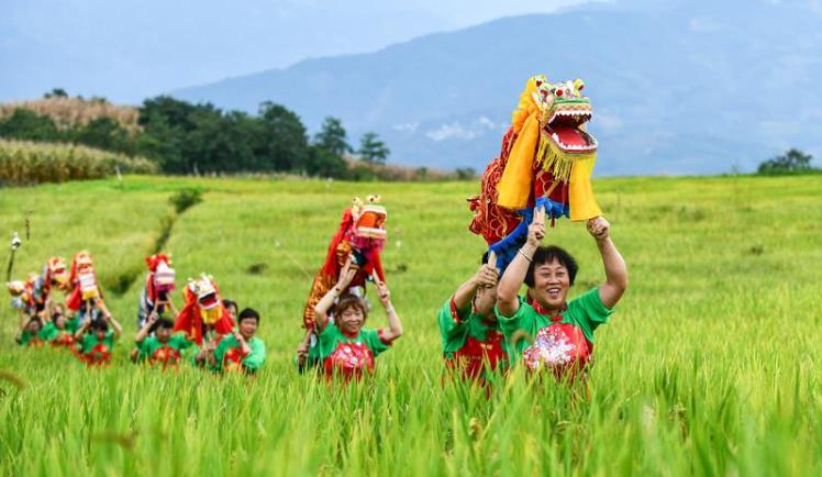 9月20日,在旱地優質稻種植示范區,當地群眾抬著板凳龍在田間穿行。