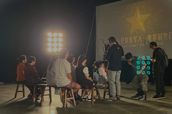 四五米的幕布在地上組裝好、六七個(gè)人合力支撐起、幾十上百來人在臺下就坐觀看……這一幕似曾相識?那是刻在我們童年記憶里的十里八鄉(xiāng)露天放的電影!只不過這次是在農(nóng)影中心的攝影大棚里,為了還原出最真實(shí)的場景拍攝,我們真的把一整套露天電影的設(shè)備搬入攝影棚里,耳邊仿佛又聽到那熟悉的聲音:看電影啦!