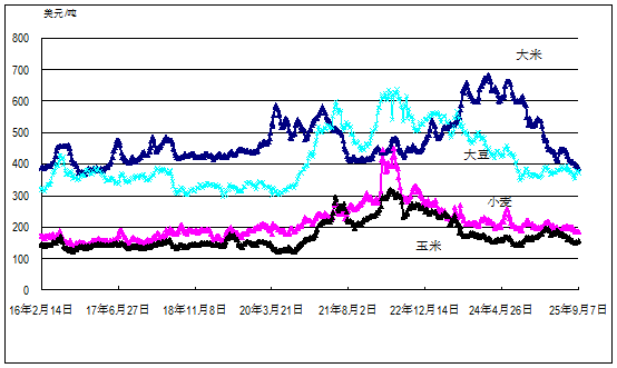 2. 小麥價格環比基本持平。美國芝加哥商品交易所小麥最近期貨合約收盤周均價每噸186美元,環比基本持平,同比低9%。