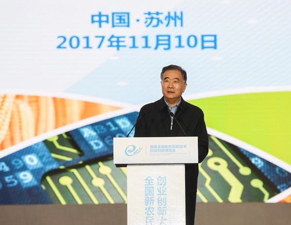 11月10日,首屆新農民新技術創業創新大會在江蘇省蘇州市召開,中共中央政治局常委、國務院副總理汪洋出席并講話。新華社記者 季春鵬 攝